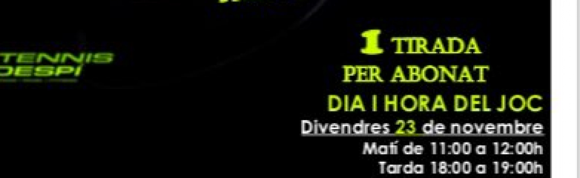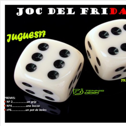 Mañana viernes hay BLACK FRIDAY en el Tennis Despí! Los abonados podréis disfrutar del JUEGO DEL FRIDADO que os hemos preparado. Disponéis de 1 tirada por abonado de 11h a 12h de la mañana y por la tarde de 18h a 19h, ganan premio los números que sean pares en el dado que pueden ser: