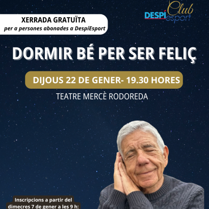 Inscripciones charla sobre el sueño "Dormir bé per ser feliç" del Dr. Eduard Estivill, a partir del 7 de enero a las 9 horas en: DespiesportClub (web activa a partir del 7 de enero). Cada persona abonada podrá inscribirse y llevar uno/a acompañante.