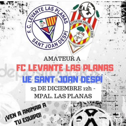Aquest diumenge 23 de desembre, a les 12 hores, tenim un gran derbi! Jugarà el Levante Las Planas amb la Unió Esportiva Sant Joan Despí al Camp Municipal de les Planes. Sort als dos equips i que guanyi qui faci més mèrits!
