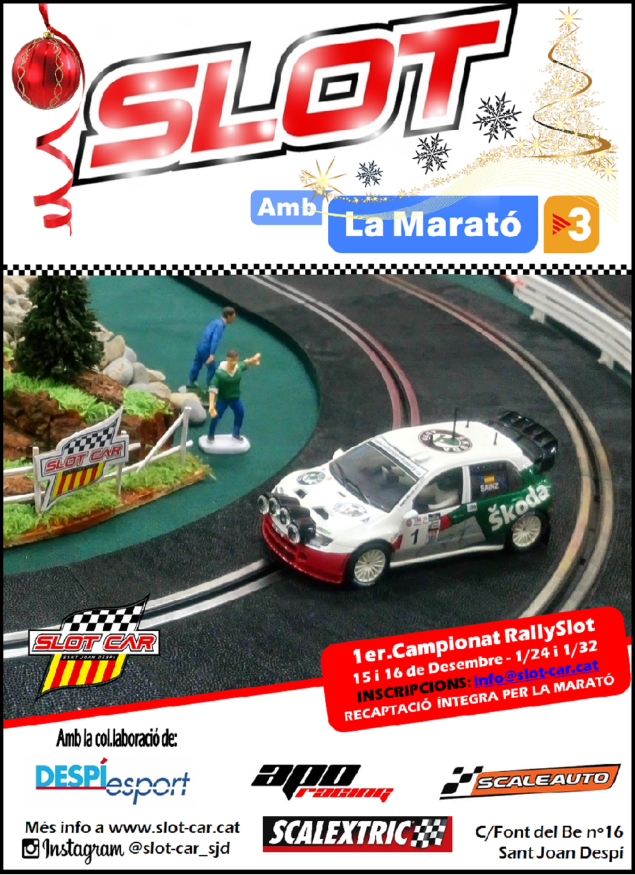 L'SlotCar Sant Joan Despí us convida a participar en la Marató de TV3 d'enguany. No us perdeu el Primer Campionat de RallySlot els dies 15 i 16 de Desembre. Gaudireu d'uns dies en família mentre participeu en una bona causa donat que tota la recpatació anirà de manera íntegra per la Marató. Trobareu més informació a info@slot-car.cat.