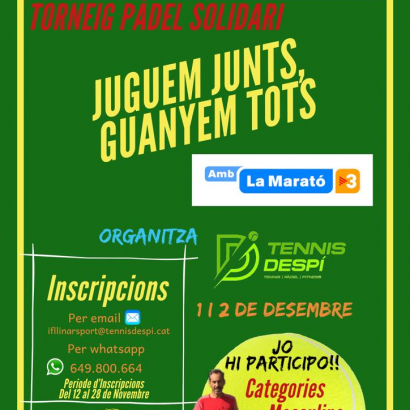 El Tennis Despí organitzarà un torneig de pàdel solidari el proper 1 i 2 de desembre a les seves instal·lacions. On el diumenge dia 2 vindrà la televisió catalana (TV3) a gravar el torneig coincidint el dia de la Marató. Les inscripcions estan obertes del 12 al 29 de novembre amb el preu de 15 € i les podeu fer via email ifllimarsport@tennisdespi.cat o per Whatsapp 649800664. El Tennis Despí al costat de tots els que pateixen o han patit aquesta malaltia,
